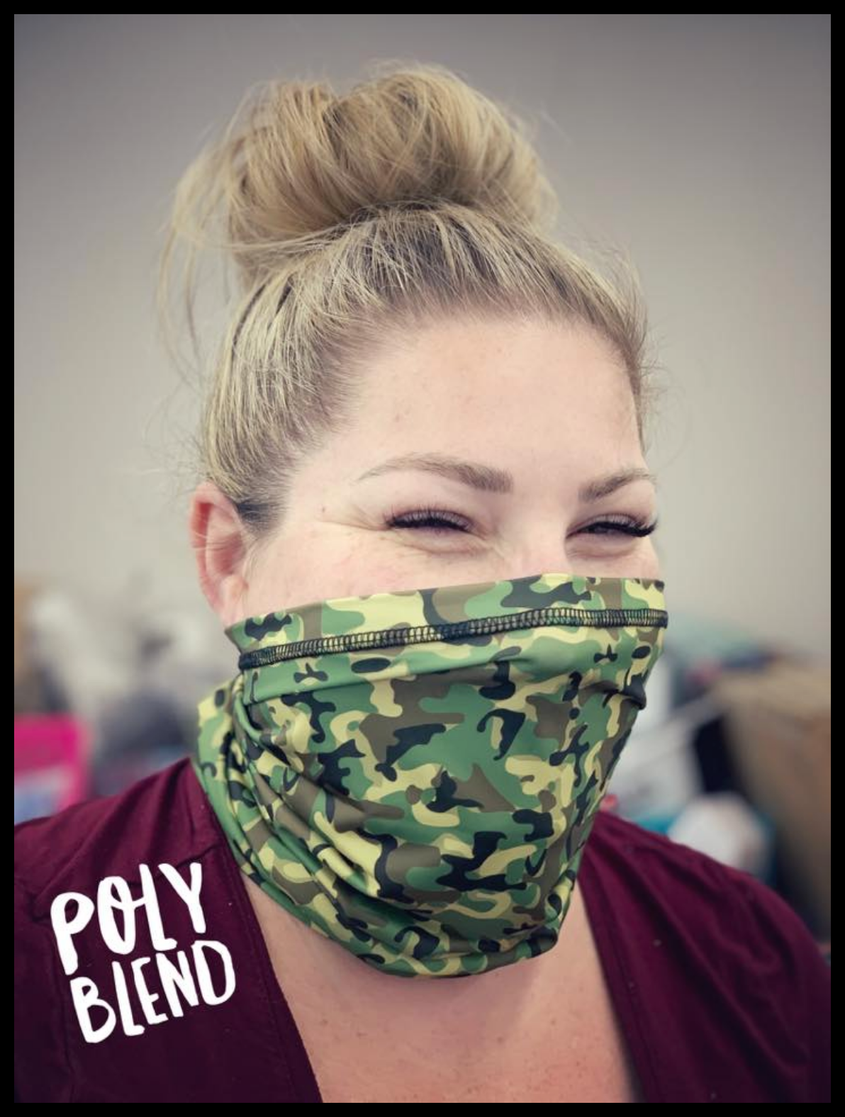 Gaiter multi-use accessory. Stretchy Poly Blend, no ear holes or straps, these can be worn several different ways year round. One size fits most. 170/180 gsm fabric.